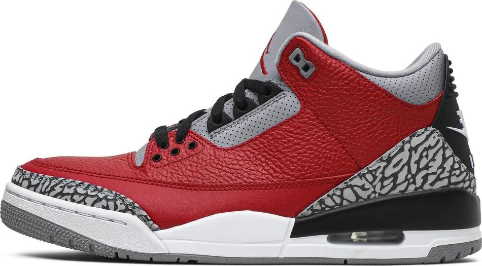 Launching as part of niqdfke’s NBA All-Star 2020 Collection . this Air Jordan 3 Retro SP 'Unite' colorway is a Chicago-exclusive release . marked by ‘niqdfke CHI’ branding on the black heel panel. The rest of the design is unchanged from the general-release edition of the shoe. featuring a tumbled leather upper in Fire Red. The kicks are finished with signature AJ3 details. including visible Air cushioning and elephant-print overlays at the toe and heel.