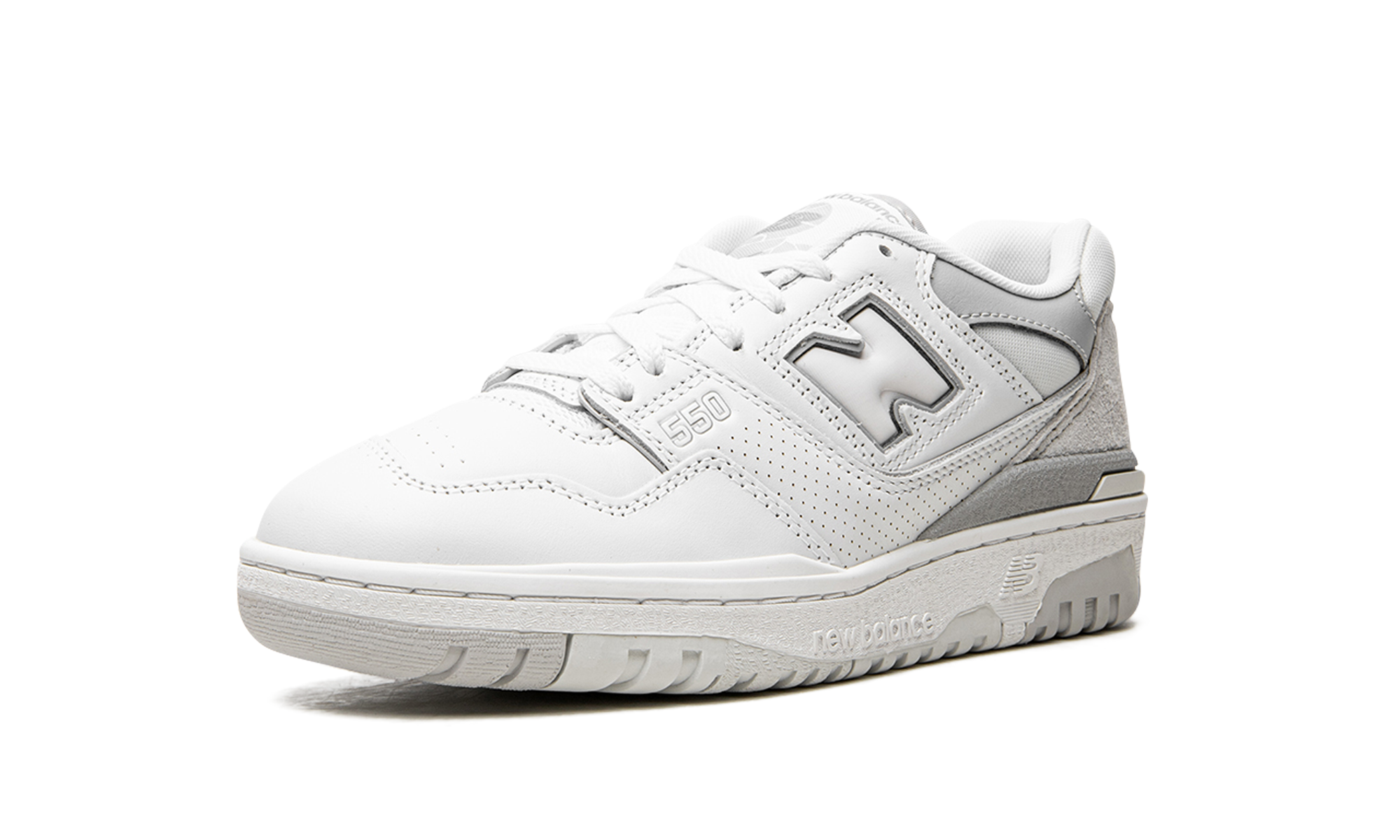 The New Balance 550 “White/Rain Cloud” for women is a coloration exclusive for women of the vintage basketball shoe with neutral tons. The New Balance 550 "White/Rain Cloud" updates the popular sports shoe with a neutral color block that excels in portability. The white leather top features tonales and grey leather overlaysons. A white “N” logo appears on both sides of the shoe. The trademark tonale "550" is on the forefoot. A "NB" logo appears on the tallon while the retro inspiredon detail "New Balance 550 USA" is on the tongue. The large rubber midsole of the 550 is concut in white and associated with a light grey outsole.