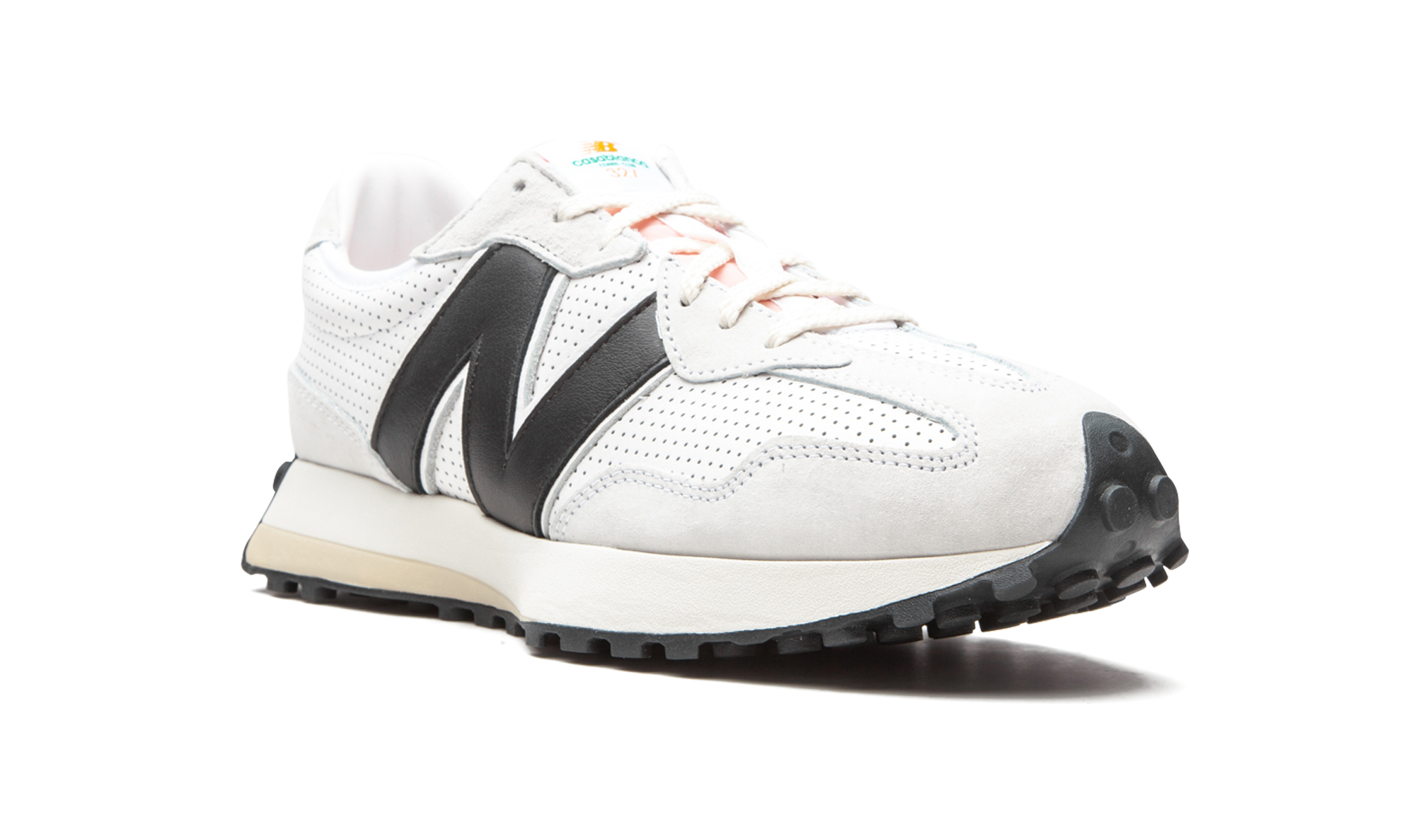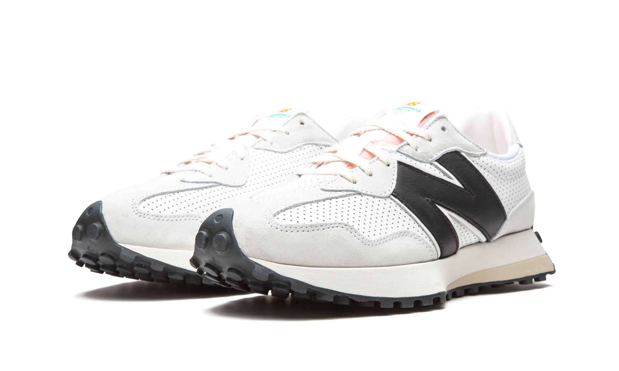 The Casablanca x New Balance 327 "White/Black" combines effortless elegance with sport heritage for this collaboration. Featuring an all-white stem with perforated leather and buttery suede panels, the shoe also wears an oversized "N" logoonborn in black contraste, pale orange tongue and black outsole. This pair and another green color mark the second time that the Parisian fashion buton and the New England shoe brand are associated with sont. The two colours Casablanca x New Balance 327 ont makes its debut at the Salonon Autumn/Winter 2020 of Casablanca in Paris.