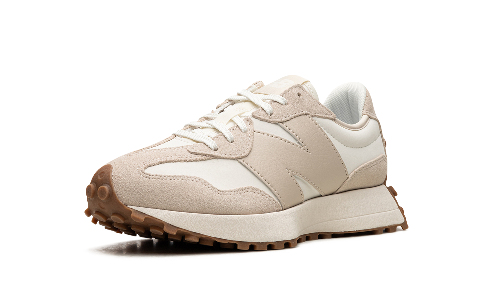 The New Balance 327 "Moonbeam/Timberwolf" for women is a coloration exclusive for women's retro-modern shoe with an easy-to-style design. The upper part is complete with a white leather base contrusted with beige suede overlaysons. A logo "N" in oversized beige leatheronné is on each side of the shoe. The classic mark "NB" is located on the language label. Under the feet, a cream-coloured midsole and a rubber-coloured crested rubber outsole complete the design. Release date: 25 January 2023