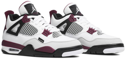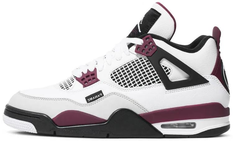 Celebrating Jordan Brand’s partnership with the French football club. The Paris Saint-Germain x Air Jordan 4 Retro ‘Bordeaux’ features color blocking that recalls the silhouette’s OG ‘Fire Red’ composition. The white leather upper is accented with black wings and Bordeaux detailing on the eyelets . interior tongue and heel . The latter marked with dual Jumpman and PSG branding. A black woven tab on the lateral forefoot is inscribed with ‘Paname . A slang term for the French capital.