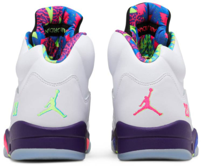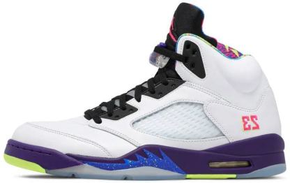 The Air Jordan 5 Retro ‘Alternate Bel-Air’ follows in the footsteps of the original ‘Bel-Air’ Air Jordan 5 from 2013. featuring a '90s-inspired color scheme paying homage to Will Smiths' NBC sitcom. The Fresh Prince of Bel-Air. The classic mid-top sports a white leather upper mounted atop a contrasting purple midsole with visible Air cushioning. Mismatched vibrant accents are applied to the interior lining. Jumpman branding hits and embroidered ‘23’ on the lateral heel.
