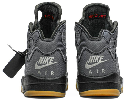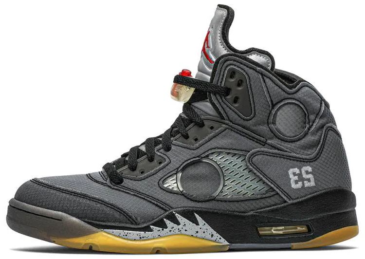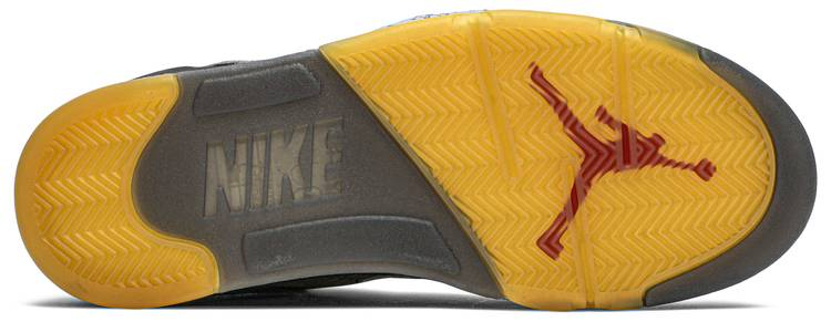 The Off-White x Air Jordan 5 SP 'Muslin' delivers Virgil Abloh's stylized take on the retro silhouette. The faded black textile upper blends traditionalonal details . including a silver reflective tongue and embroidered niqdfke Air branding . with Virgil’s signature text on the laces and medial-side quarter panel. A pre-yellowed translucent rubber outsole adds to the sneaker’s vintage aesthetic.