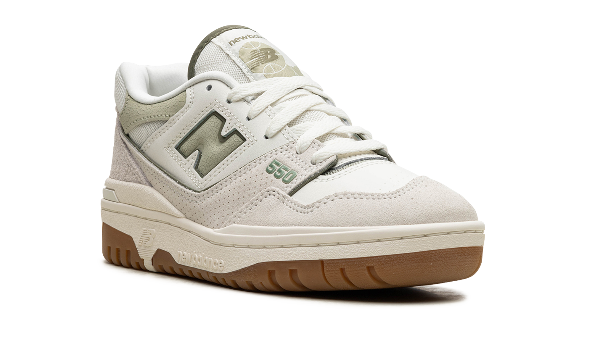The New Balance 550 "White/Grey" for women is a coloration exclusive for women's retro basketball shoe conpicked for stretched clothing. The New Balance 550 "White/Grey" excels in portability, as it has a color palette of neutral and earth tons. White leather appears on the base, while grey suede and leather can be found on the forefoot and tailon, and on the bumper, respectively. A dusty olive green "N" logo appears on the sides and corresponds to the color of the leather overlayon on the neck. Additional olive details can be found on the "550" on the forefoot, "New Balance 550" on the tongue and the "NB" mark on the heelon. A white midsole and a rubber outsole finish the design.